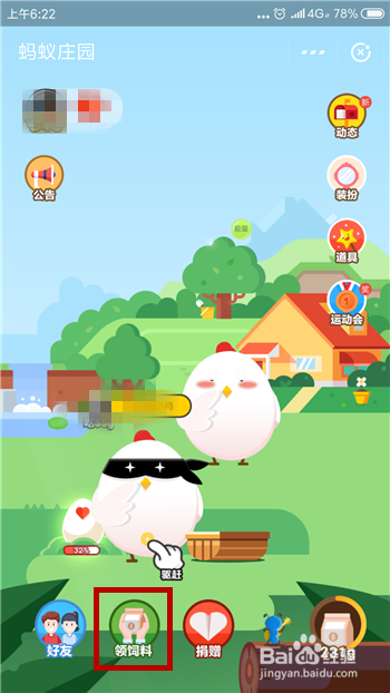 在蚂蚁庄园应用的下方是领饲料使命,点击打开领饲料使命。