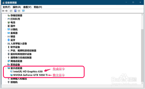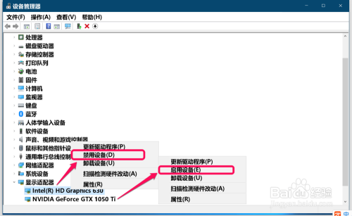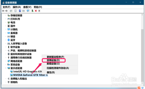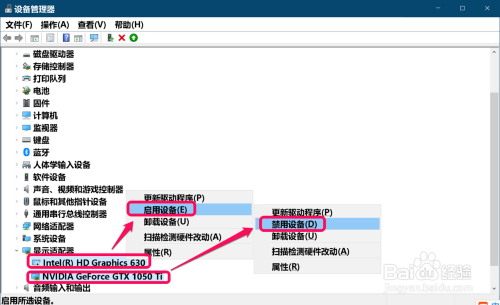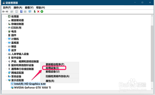 右键点击:Intel(R)HD Graphics 630,在右键菜单中若是看到:禁用设备(D)则今朝利用的是集当作显卡,此时若是右键点击:NVIDA GeForce GXT 1050Ti,则右键菜单中必然会显示:启用设备(E);