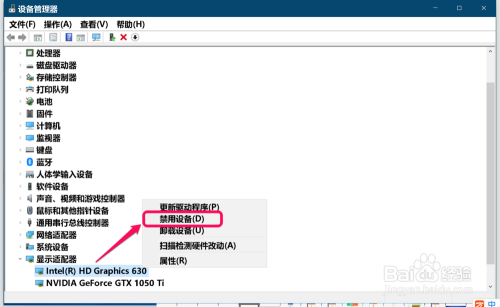 当显卡切换到集当作显卡Intel(R)HD Graphics 630今后,我们右键点击:Intel(R)HD Graphics 630,可以看到右键菜单中的【禁用设备(D)】,再右键点击自力显卡NVIDA GeForce GXT 1050Ti,在右键菜单中可以看到【启用设备(E)】;