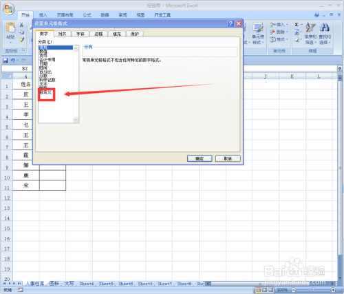 在设置单位格格局对话框中,选中“数字”选项卡,找到“分类”下面的“自界说”单击