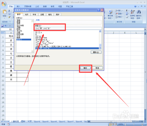 在自界说类型下面输入“[=1]"男";[=2]"女" ”,完当作后单击“确定”