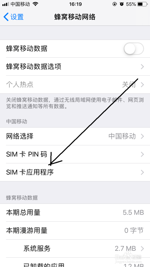 打开蜂窝数据收集界面中点击sim卡应用法式选项。