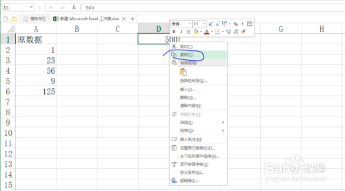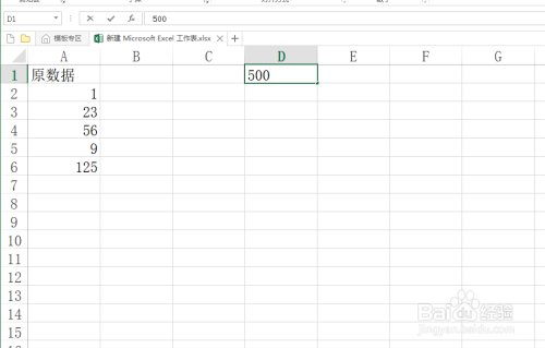 首先在肆意一个空白单位格输入数据500,教程以D1单位格为例。
