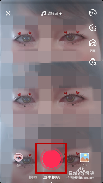 利用了道具后会呈现三格视频结果,并且圣诞眼泪妆有三个结果可以选择,选择后可以看到妆容结果,喜好就可以点击【录制】按钮。