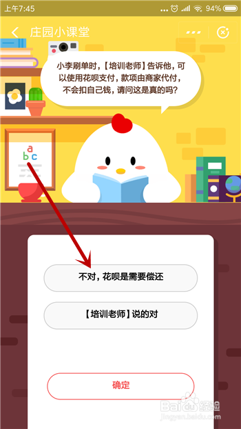 今天的标题问题仍是很是有意义的,问我们利用花呗付出的问题,谜底的话大师选择第一个,然后点击【确定】。