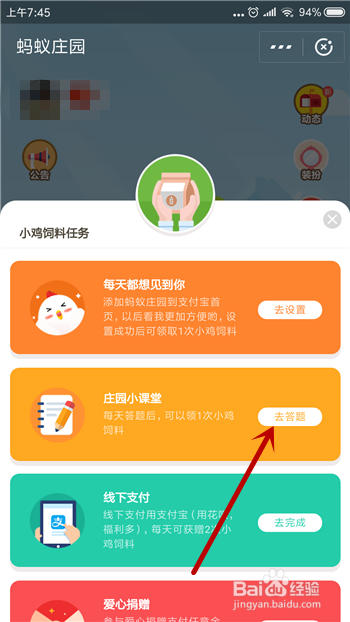 使命里找到庄园小讲堂并点击【去答题】按钮。