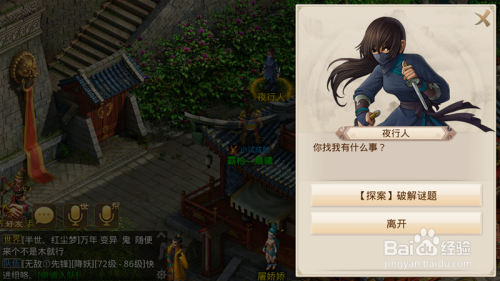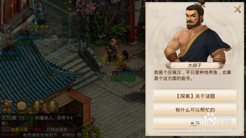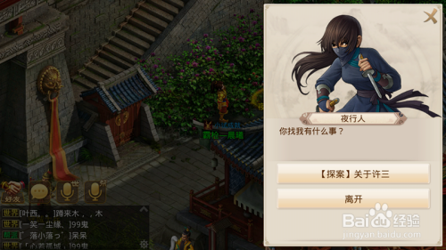 之后我们去找夜行人,问一下许三的事,不意需要帮他一个忙,去找年夜胡子,点击【探案】关于谜题。