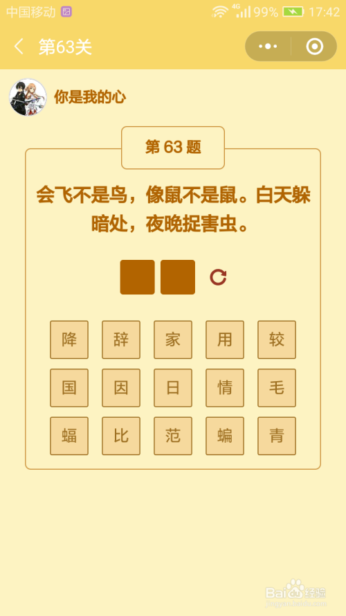 第63关谜底是蝙蝠。