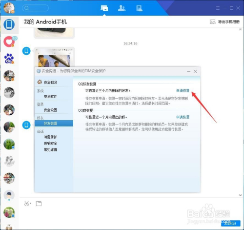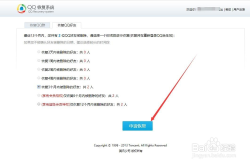 在老友恢复中我们可以恢复三个月内删除的老友,也可以恢复一个月内退出的群,这里点击申请恢复