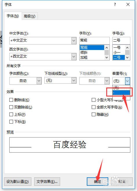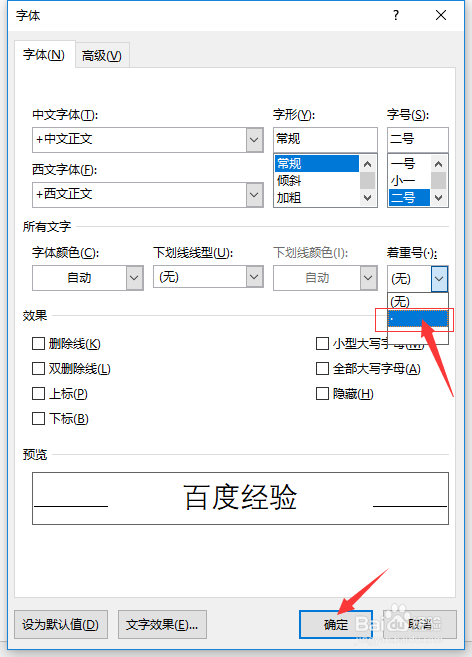 然后在弹出的对话框中找到着重号,下来,选中,确定。
