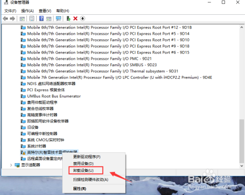 右键单击黄色感慨号的设备,选择卸载设备,如下图所示