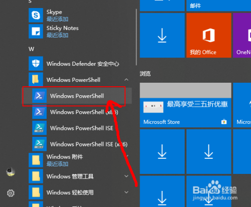 点击桌面左下角的 开始菜单 图标,然后在弹出的页面中找到 powershell 。