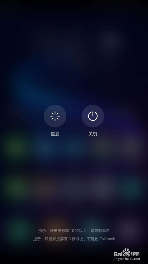 长按电源键,直到屏幕上呈现“重启”、“关机”字样。