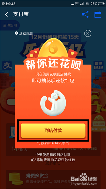 想要获得花呗还条目红包的话是需要在商家里利用花呗付条目,所以点击【到点付条目】选项。
