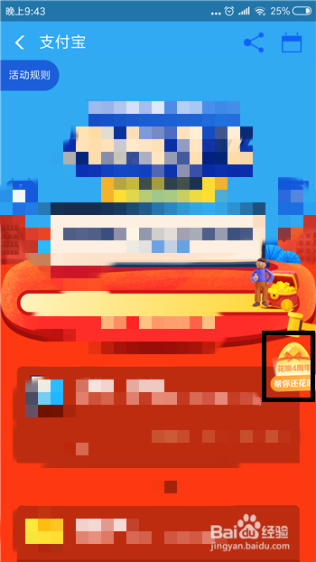 打开付出宝后在首页中可以看到【花呗彩蛋抽奖中】的活动,直接点击打开活动。