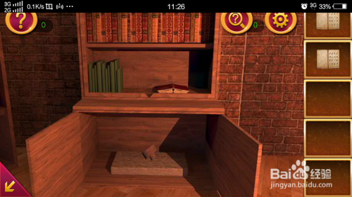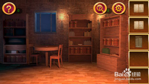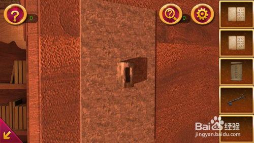 我们点击最右侧书厨侧面的上方,发现钥匙孔,插入钥匙即可过关。