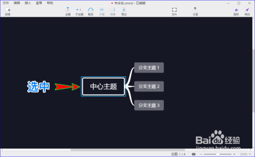 打开电脑,直接进入到我们的xmind zen中,然后打开一份或者新建一份思维导图文档,找到我们要插入语音备注的中间本家儿题或分支本家儿题。