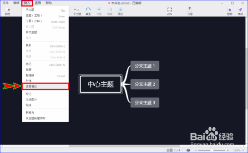 找到后,我们选中要插入语音的本家儿题,接着在xmind zen软件顶部的菜单栏里找到并点击“插入”菜单,然后鄙人拉菜单里选择“语音备注”菜单。