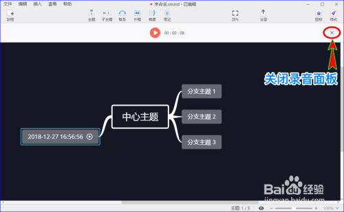 点击“语音备注”菜单之后,在xmind zen顶部菜单里下面就会呈现语音的灌音按钮,我们按下按钮就可以起头灌音了。