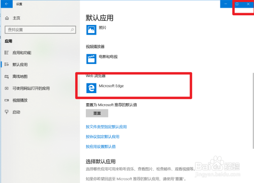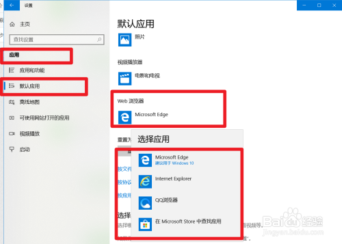 第五步,进入到应用设置页面,在左边点击默认应用,然后在右手边找到web浏览器,接着进行浏览器的选择,如图所示。