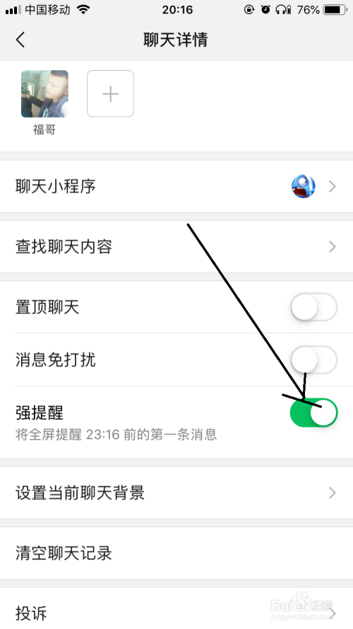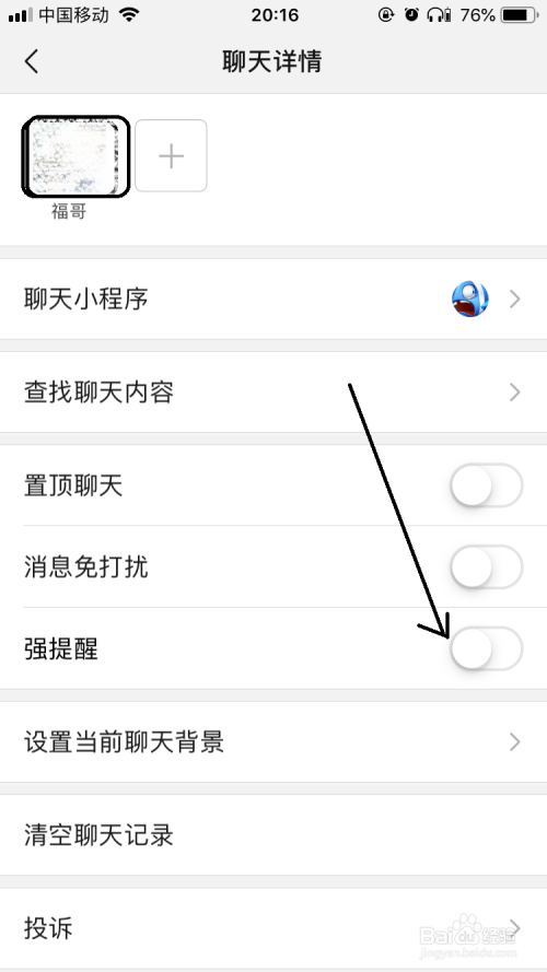 然后打开聊天详情界面中点击强提醒开关按钮。