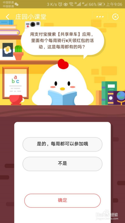 第五步,既然是讲堂,天然就要做题看标题问题,标题问题是付出宝里面推出了一个活动,那就是你每周骑行共享单车X天就可以领取红包,这是不是真的呢?