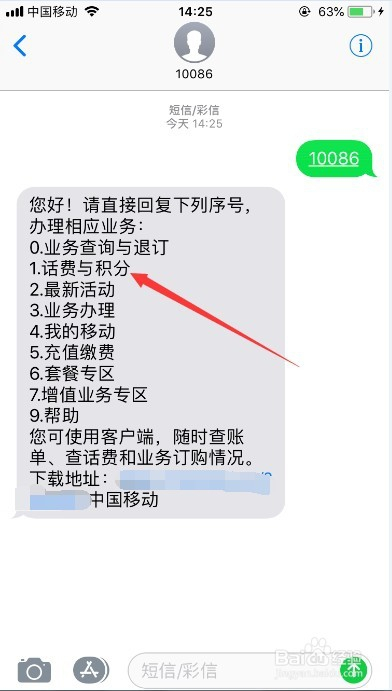 经由过程发送短信,直接编纂10086到10086,然后按照提醒答复响应数字,就会收到短信通知你的积分余额,如图所示。