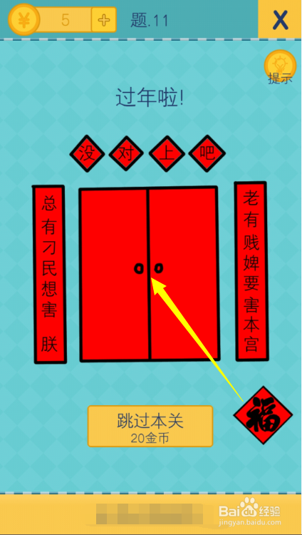过年啦,当然要贴福字,把福字移到门的两个把手上,然后把手机倒过来代表福到,即过关。