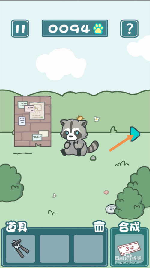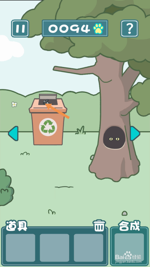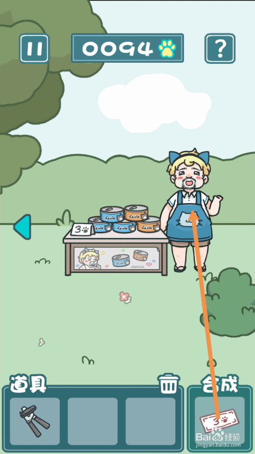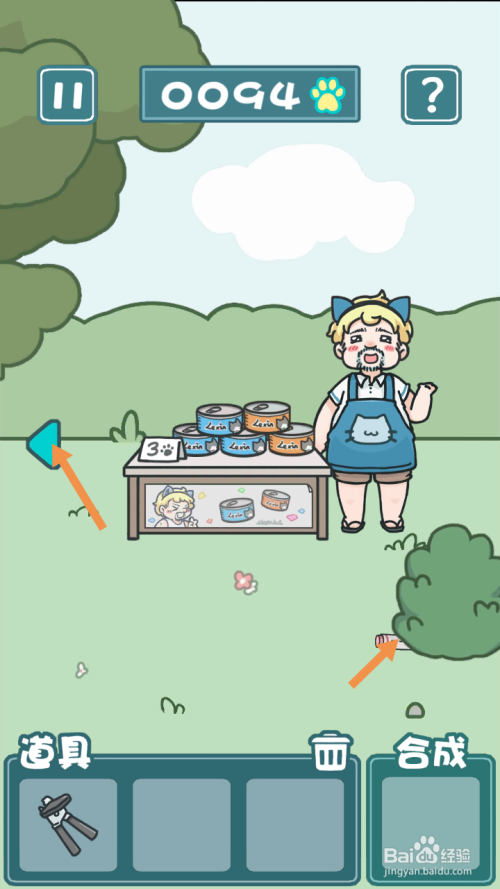 在右边,点击标的目的右箭头到最右边去。在最右边,将手绘猫币拖动到卖罐头的人身上。