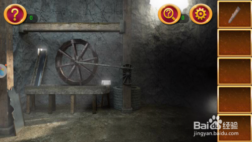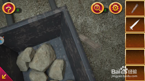 点击右面的暗中处,进入第二间密屋,点击运石头的车,拾取里面的刀。