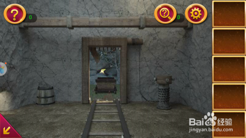 点击中心装石头的小车,点击右面的木棒,将门撞开。