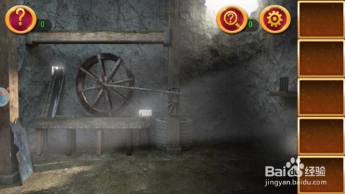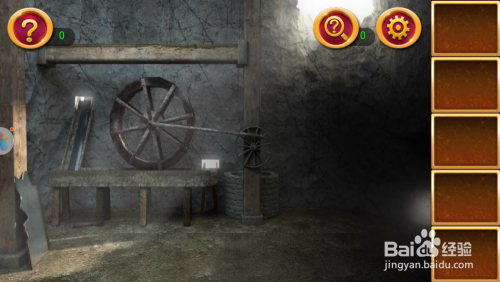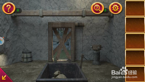 点击进入第二件密屋,点击左面木桶,操纵水桶获取木桶里面的水。