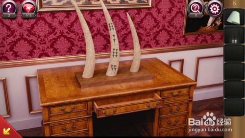 然后我们点击左侧上面放有两根好的象牙和一根损坏的桌子,用螺丝刀点击桌子,打开抽屉,获得了胶水。