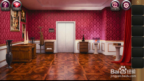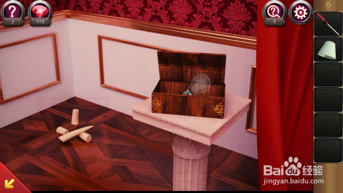 然后我们再点击右边红布旁的白色小桌,打开盒子获得了一个灯胆,捡起左侧的破裂的白色物品石膏或者是破损的象牙吧。