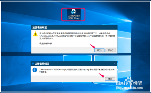 我们在系统桌面上找到并左键双击【封闭图片主动压缩功能.reg】注册表文件图标,在先后弹出的注册表编纂器对话框中点击:是(Y)和确定。