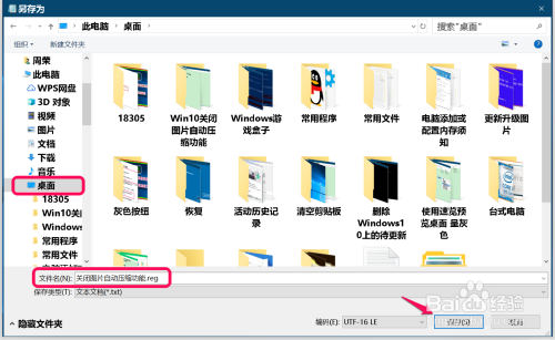 在另存为窗口中,我们先点击窗口左侧的【桌面】,在文件名(N)栏中输入:封闭图片主动压缩功能.reg,再点击:保留;