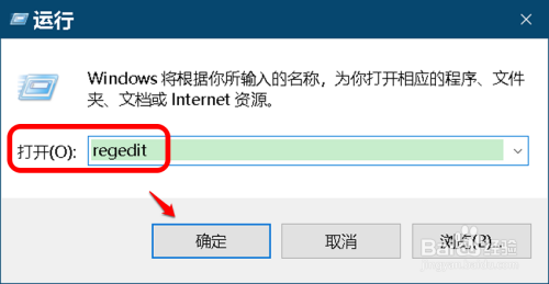 在运行对话框中输入:regedit,点击确定或回车,打开系统注册表编纂器;