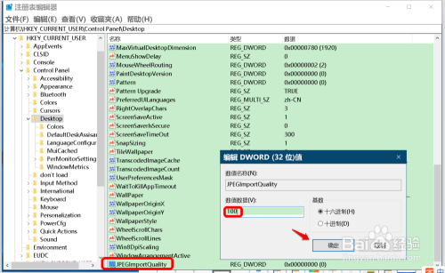 我们将新建#1定名为:JPEGImportQuality,左键双击:JPEGImportQuality,在编纂 DWORD(32位)值 对话框中,将 JPEGImportQuality 的数值数据更改为:100(十六进制),点击:确定;
