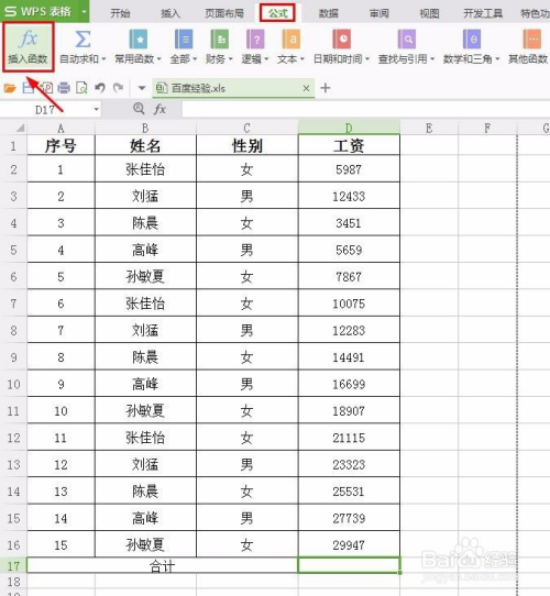 第三步:在菜单栏“公式”中选择“插入函数”按钮。