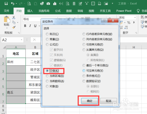 在定位对话框选择定位前提,选择空值后点击确定。