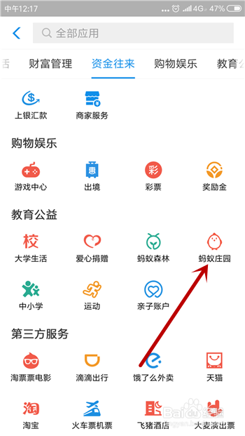 在付出宝的应用界面中找到教育公益,然后鄙人方找到【蚂蚁庄园】并点击打开。