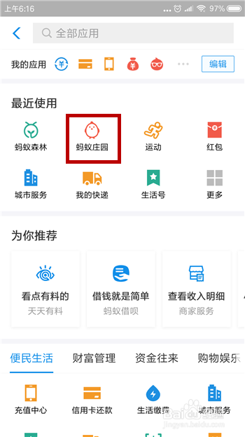 打开更多应用后即可在比来利用中点击打开蚂蚁庄园。