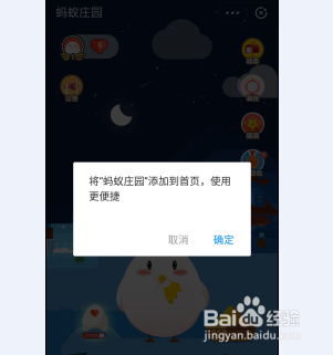 弹出对话框:将蚂蚁庄园添加到首页,利用更便捷。点击【确定】。