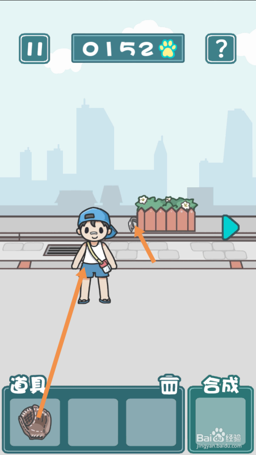 在最左边,点击物理学圣剑,然后将棒球手套拖动到小男孩身上。