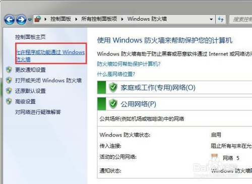 除了封闭windows防护墙之外,另一种设置就是对电脑上安装的法式进行屏障上网设置了。我们先点击许可法式或功能经由过程windows防护墙选项。
