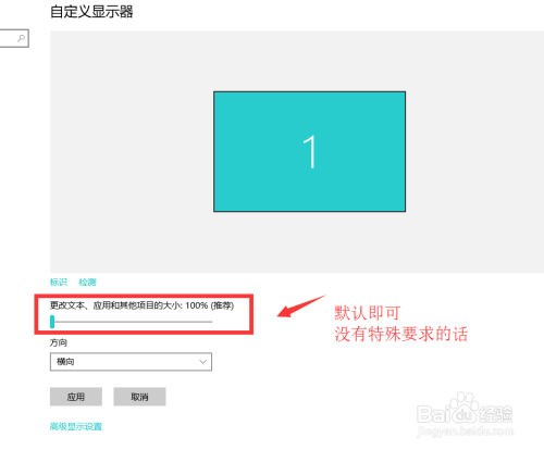 在自界说显示器页面点击高级设置,就可以跳转到我们要找的分辩率设置页面。我们选择保举的分辩率,点击应用即可。