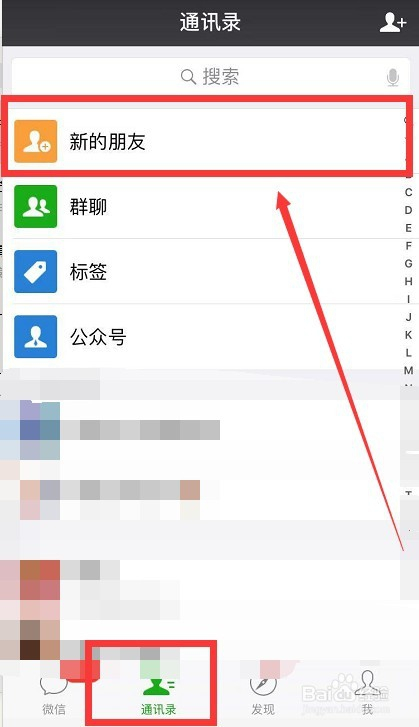 1、方式一:点击微信-通信录,点击上面的新的伴侣,如图: