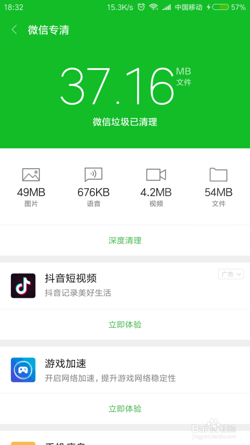 同样的点击微信专清,进去之后就会清理微信中的垃圾,但这还不敷彻底。