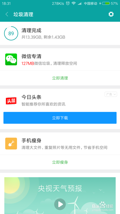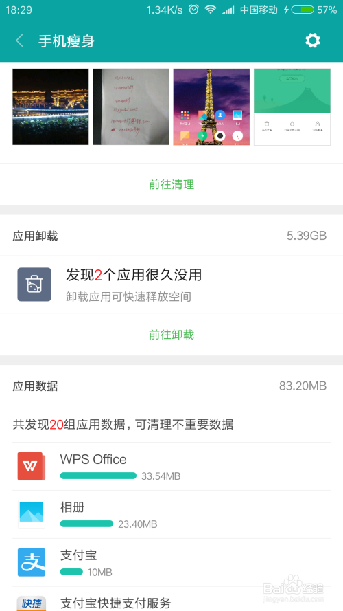 让其继续运行,可清理一少部门垃圾,点击“手机瘦身”。