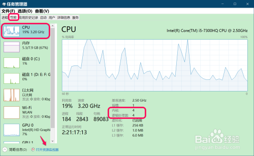 在资本监督器窗口中,我们点击:CPU,在右侧窗口中。可以看到:CPU 0、CPU 1、CPU 2 和CPU 3四个小窗口,也可以申明本机i5-7300HQ CPU焦点数为4核。